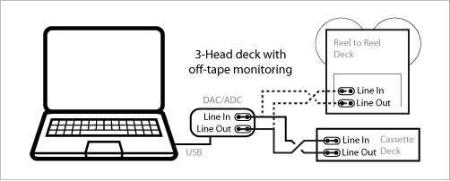 Please connect the computer's line-out port to the 3-head tape recorder's line-in port (maybe via a USB DAC); and connect the 3-head tape recorder's line-out port to the computer's line-in port (maybe via a USB ADC): |