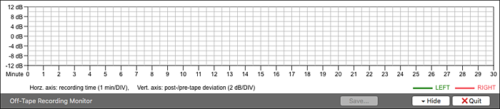 Once the monitor is active, there is a small dot shown up next to the "Tape Monitor" button label. To hide the monitor, click on the "Tape Monitor" button again, or click on the "Hide" button at the bottom. The monitor will continue work in the background with the small dot keeps on. To bring the monitor back, just click on the "Tape Monitor" button again, no data will be lost. To quit the monitor, click on the "Quit" button, the monitor will stop and close, and the small dot will be off. To re-start the monitor, click on the "Tape Monitor" button, it will re-start from the calibration stage. When the app start playing audio tracks, a spinning icon labeled "Synchronizing" will show up, indicating that the minitor is trying to align the incoming and outgoing audio streams to a common timebase. The length of "synchronizing" period may vary depending on the actual audio content. Upon success, the spinning icon will disappear, and the app will start drawing deviation curves for L and R channels respectively on the timeline as the tape recording progresses. When done, you can optionally keep the result curves to an image file by clicking on the "Save..." button. This button is disabled when the tape recording is on going. |